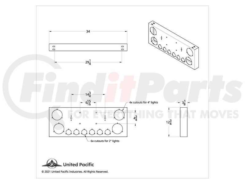 United Pacific 21493 - Tail Light Panel - Rear Center, with Four 4" Light Cutouts & Six 2" Light Cutouts